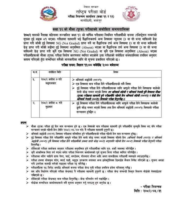 कक्षा १२ को मौका (पुरक ) परीक्षाको संसोधित समयतालिका प्रकाशन गरिएको सुचना। आमा विद्यालय 2025-11-13 13:59:31 |